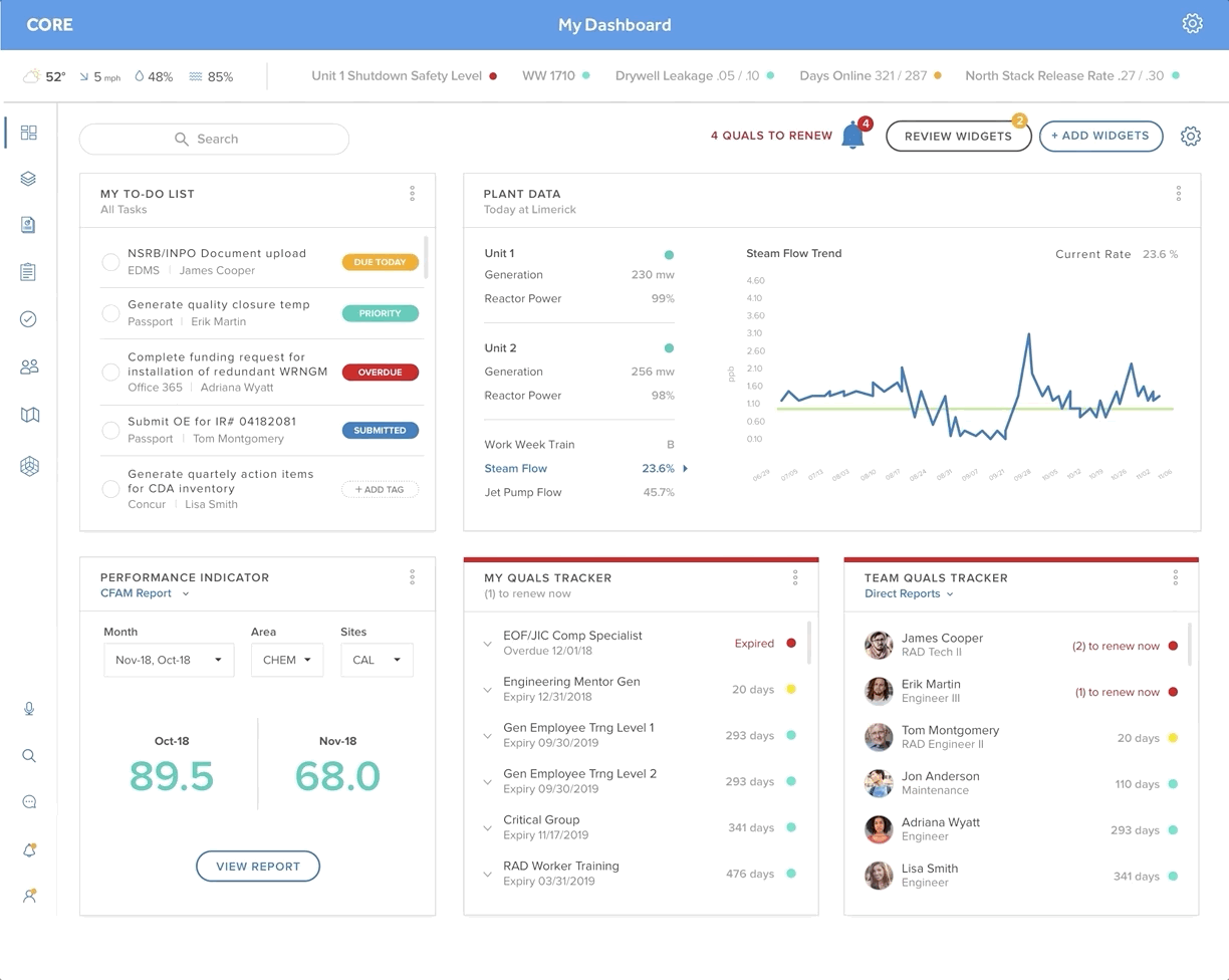 Below is an example of a manager’s layout which includes daily report highlights, plant status overviews and trend data, team status details, a work schedule, current work orders to monitor, and a task list.